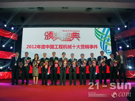這是中國工程機械第十屆營銷高峰論壇暨2012年中國工程機械代理商年會“ 2012年度中國工程機械十大營銷事件”頒獎典禮現(xiàn)場。此次活動以引領行業(yè)營銷進步、樹立行業(yè)服務典范、促進行業(yè)持續(xù)健康發(fā)展為旨,組織近50家企業(yè)參與評選,公正權威。徐工以占據行業(yè)發(fā)展制高點為視野,圍繞大噸位裝載機強力實施差異化戰(zhàn)略,以智能化與信息化加速傳統(tǒng)工程機械制造業(yè)的轉型升級,用實力沖破外資品牌的壟斷,捍衛(wèi)國產大噸位裝載機的地位,在行業(yè)內產生巨大影響。